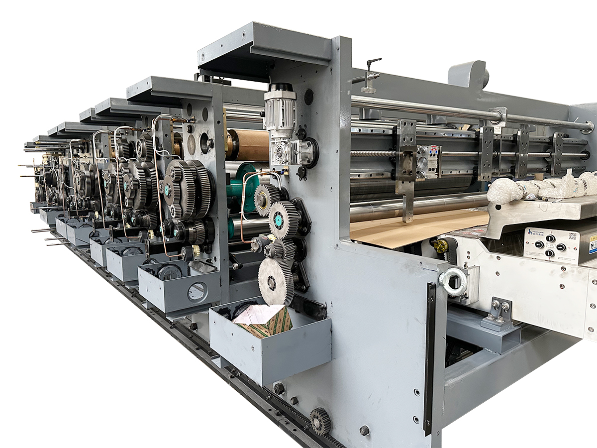 The slotter unit in this flexo printer slotter, die cutter and stacker is used for making standard corrugated cartons. It can complete slotting, creasing, slitting and corner cutting at one stroke. Slotting size and carton height is motorized or manual adjust.